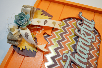 I used the chevron patterned paper to cover the backside of the pumpkin and adhered the "thankful" with Glue Dots. I added the leaves to the burlap bow and hot glued it to the frame. I then realized the bow was missing a little something...so I added another bow. I layered the extra bow made from May Arts leaf linen ribbon and added the flower to the center.